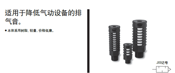 适用于降低气动设备的排气音;本体采用树脂,轻量、价格低廉.