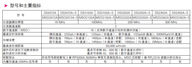 带宽达300MHz,标配50Q输入阻抗;垂直灵敏度范围:500uV/div~10V/div;实时采样率模拟通道达2GSa/s;数字通道达1GSa/s(MSO);标配存储深度模拟通道达14Mpts,选配达56Mpts;数字通道标配达14Mpts,选配达28Mpts;波形捕获率达50,000个波形每秒;标配多达6.5万帧的硬件实时波形不间断录制功能和波形分析功能;内置双通道25 MHz信号源;丰富的接口:USBHost&Device.LANtLXIhAUX.USB-GP旧(可选);8英寸WVGA(800x48