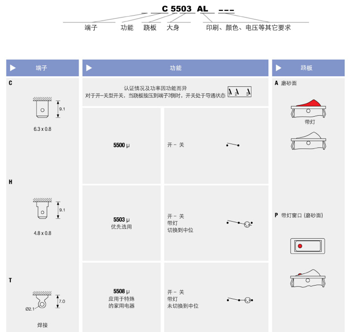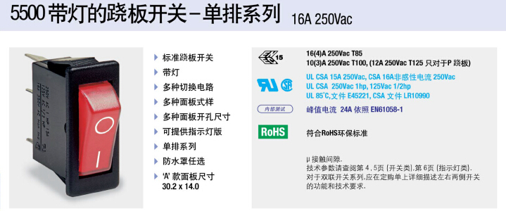 带灯,多种切换电路,多种面板式样,多种面板开孔尺寸; 可提供指示灯版,单排系列,防水罩任选;