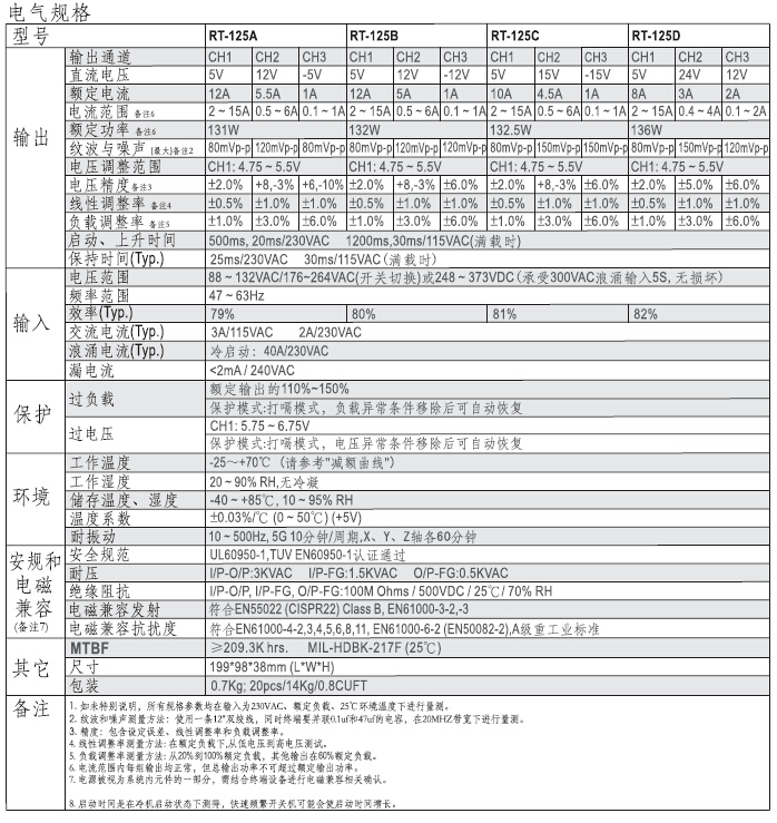 保护种类:短路/过负载/过电压;自然风冷;LED电源指示;100%满载老化;全部使用105°C长寿命电解电容;能承受300VAC浪涌输入5秒;工作温度高达70°C;承受5G振动测试;高效率,长寿命和高信赖度;3年保固。
