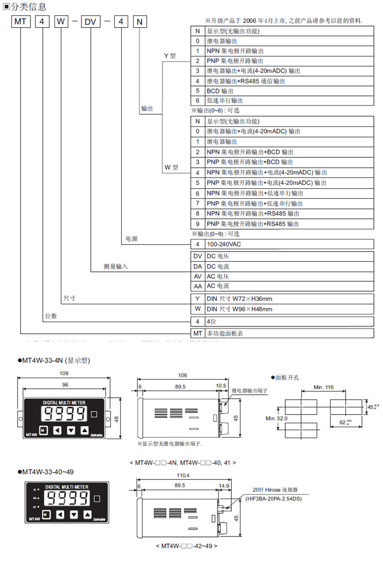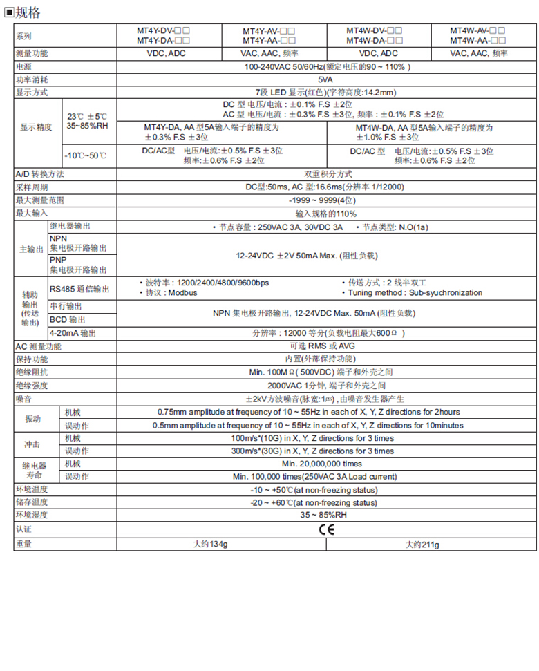 超级功能面板表;多种输出选择(基本规格:显示型)RS485通信输出,低速串行输出;电流(4-20mA),BCD输出,NPN/PNP集电极开路输出, 继电器输出;最大测量输入规格:500VDC, 500VAC, DC5A, AC5A;最大显示范围:-1999 ~9999 ;高/低限位缩放功能;AC频率测量功能:0.1~9999Hz;多种功能:最大和最小值监视功能,显示周期延迟功能,归零功能,显示校正功能,电流输出缩放功能;宽电源范围:100-240VAC