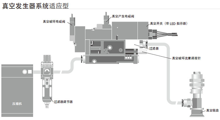 提供了真空发生器系统适用的和真空泵适用的装置,适应各种真空系统应用;