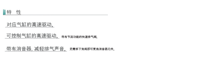 对应气缸的高速驱动„ 可控制气缸的高速驱动;带有节流功能的快速排气阀;带有消音器,减轻排气声音;无需拆下旁阀即可更换消音器元件。