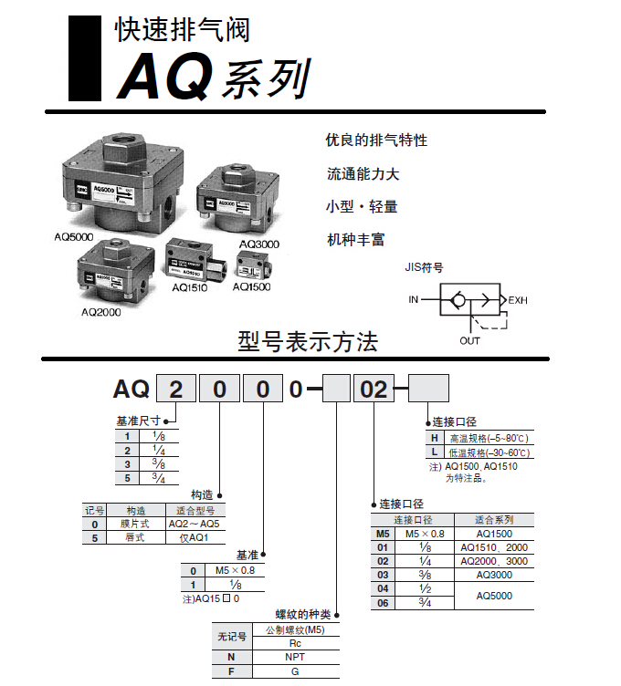 优良的排气特性;流通能力大;小型;轻量;机种丰富。