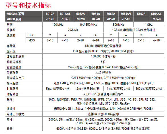 100 MHz至1 GHz数字存储和混合信号示波器;捕获并比较模拟、数字和串行信号;100,000个波形/秒的更新速率;;唯一配有电池供电选件的高性能示波器;可在不使用市电的情况下持续工 作两小时以上;串行总线触发/解码选件,包括l2C、SPI、CAN、LIN、l2S、RS-232/UART、 MIL-STD 1553 和 FlexRay。