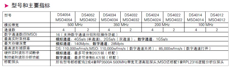 模拟通道带宽100MHz,200MHz,350MHz,500MHz;实时采样率模拟通道达4GSa/s;标配存储深度模拟通道达140Mpts;波形捕获率达110,000个波形每秒;标配多达20万帧的硬件实时波形不间断录制功能和波形分析功能;最小垂直档位达1mV/div;丰富的接口:USBHost&Device.LANtLXI-ChVGA.AUX,USB-GP旧(可选);9英寸WVGA,256级波形灰度显示.