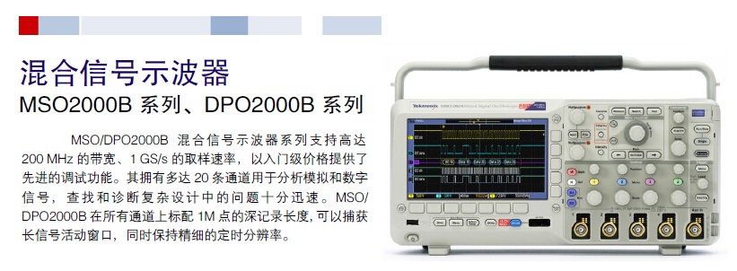 200、100、70MHz带宽型号;2个和4个模拟通道型号;通道均实现1 GS/s采样率;所有通道上的记录长度均为1兆点;最大波形捕获速率5,000 wfm/s;FilterVu™可变低通滤波器,可以去掉不想要的信号噪声, 同时捕获高频事件,29个自动测量和FFT分析可简化波形分析;TekVPI®探头接口支持有源探头、差分和电流探头进行自 动缩放和单位设置;7英寸(180毫米)宽屏TFT-LCD彩色显示器,厚度仅5.3英寸(134毫米),重量仅7磅 14盎司(3.6千克)