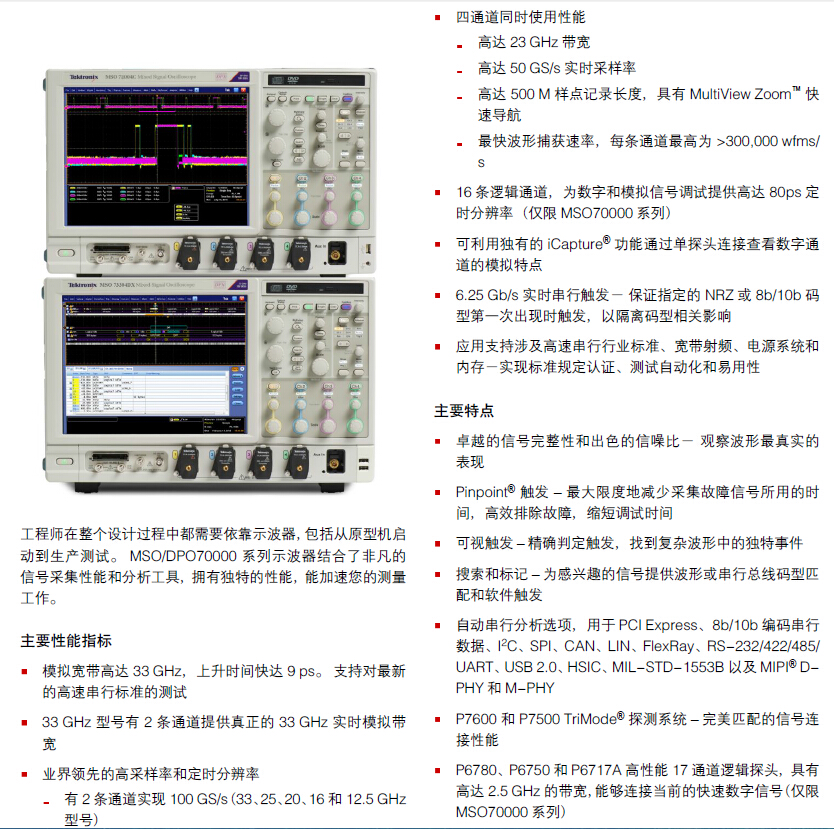 有2条通道实现100GS/S(33、25、20、16和12.50MHz 型号);四通道同时使用性能高达23GHz带宽,高达50GS/S实时采样率;高达500M样点记录长度,具有MultiView Zoom™快速导航;最快波形捕获速率,每条通道最高为>300,000 wfms/s;16条逻辑通道,为数字和模拟信号调试提供高达80ps定时分辨率(仅限MSO70000系列.