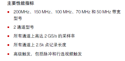 200MHz、150MHz、100MHz、70MHzft50MHzS多种型号;2通道型号;通道上高达2GS/s的采样率;所有通道上2.5k点记录长度;7英寸WVGA (800X480)有源TFT彩色显示器;34种自动测量;双窗口FFT;体积小、重量轻:深仅4.9英寸(124 mm),重仅4.4镑 (2 kg)。