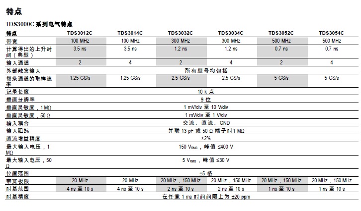 100 MHz、300 MHz 和 500 MHz 带宽型号;2或4通道;所有通道上的实时取样速率高达5 GS/s;所有通道上的标配记录长度均为10k;连续波形捕获速率3600wfms/s;前面板USB主控端口方便存储和传输测量数据;25种自动测量;FFT标配;多语言用户界面;TekPrcbe®接口支持有源、差分和电流探头,自动调整量 程和单位;重量轻(仅7磅/3.2千克).