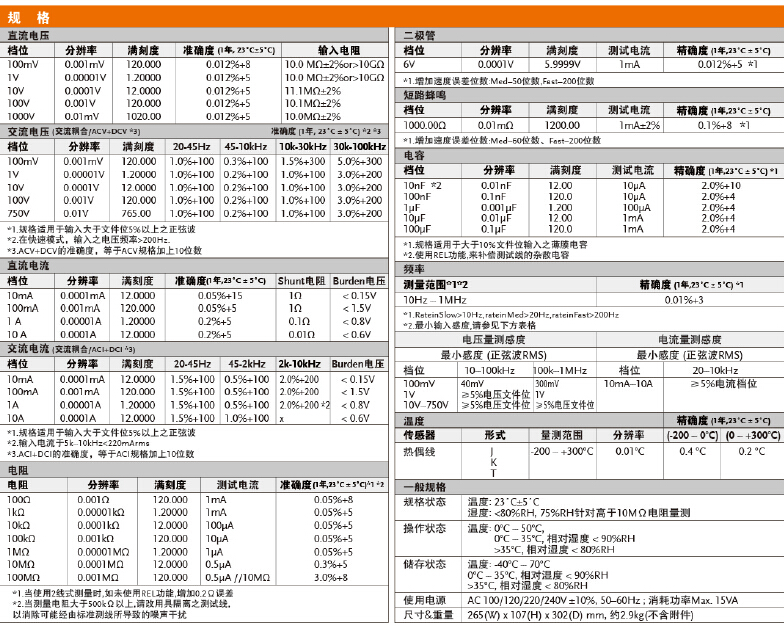 120000位数,VFD显示屏;双测量/双显示;直流电压(DCV)基本准确度:0.02%;测量速度可选择,最高可达320读值/每秒;True RMS(AC, AC+DC)测量;可选择自动/手动换档;11种测量功能:交直流电压、交直流电流、2线/4线式电阻、短路蜂鸣、二极管测量、 电容、频率、温度;多样辅助性测量功能:
