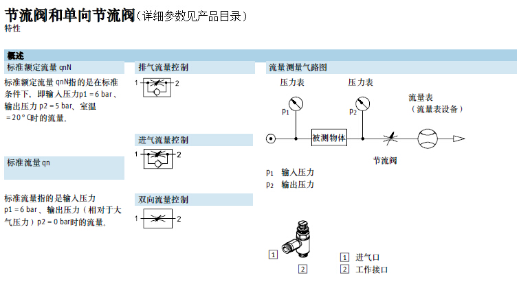 单向节流阀,用于控制进气和排气流量。节流阀,不带单向功能。适用于螺纹M3...G3/4和气管外径3...12mm;工程塑料盒金属结构,不含铜和聚四氟乙烯,耐腐蚀结构。