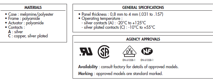 三种外形:平面型,V型或凹型,颜色多样; 密胺/尼龙外壳,尼龙框架,带灯或不带灯;