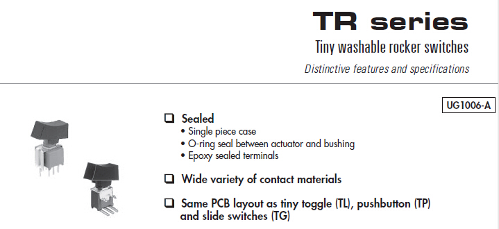 单片,形环密封传动装置和套管之间,多种多样的触点材料,PCB布局一样微小的切换(TL)按钮(TP)和滑动开关(TG); 外壳:PBT,终端密封环氧树脂;