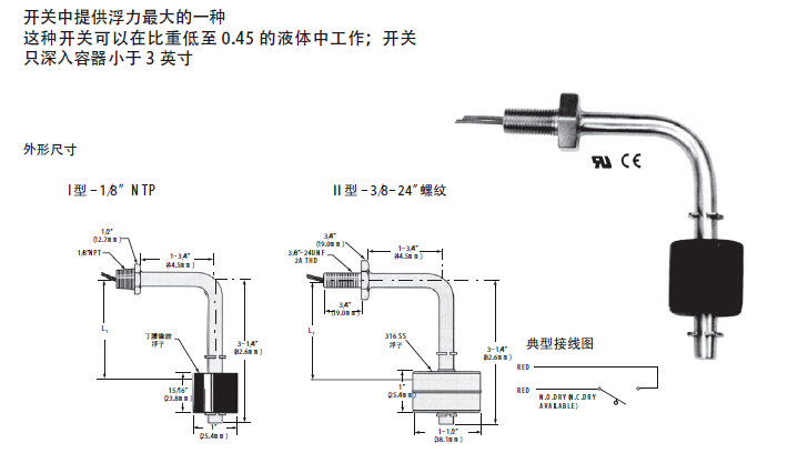大浮力开关,0.45低比重,只深入容器小于3英寸。
