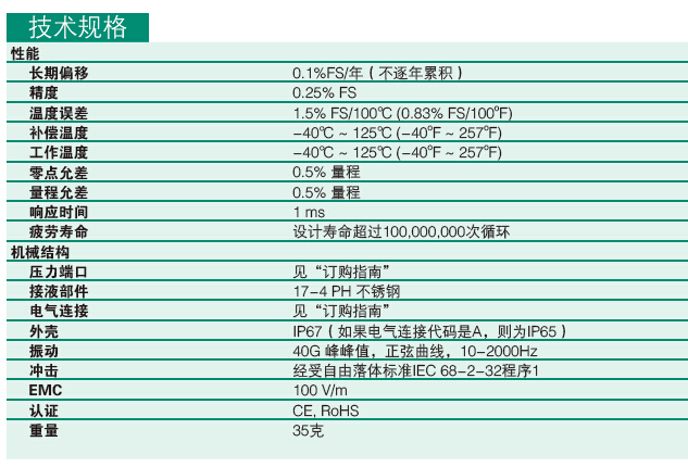 压力量程0-3.5bar到0-2200bar; 本体直径19mm,长度25mm(不含压力及电气接头); 溅射薄膜适合OEM用户; 高可靠性、高稳定性; 多种输出以及多种压力电气连接形式; 结构非常紧凑; 适合安装空间狭窄的场合.