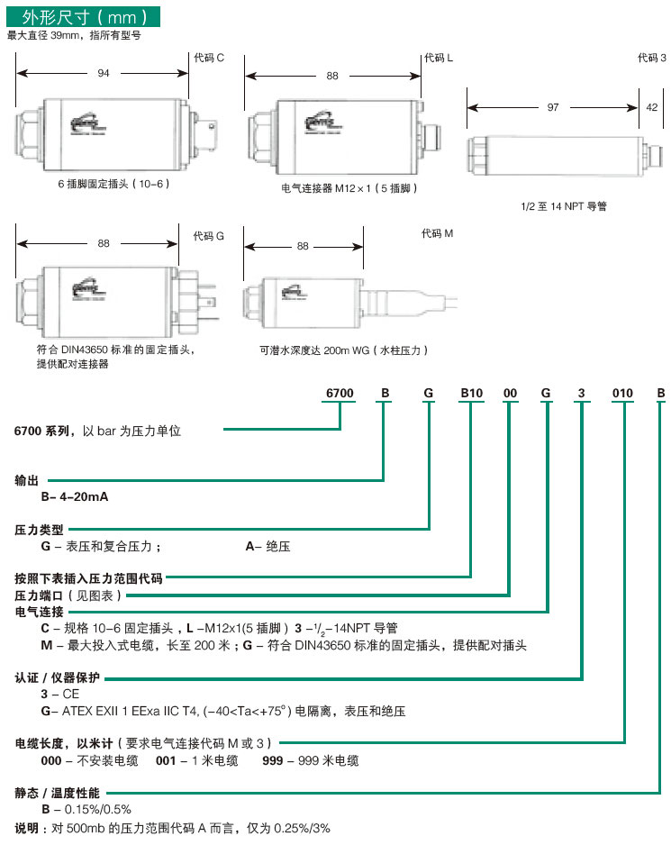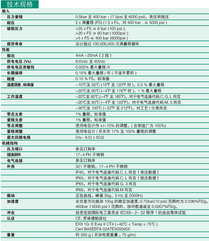 表压、绝压型; 投入式、通用型和可冲洗外壳; 采用CVD传感元件,具有极好的稳定性; 适用高过压的应用环境、恶劣工作条件.