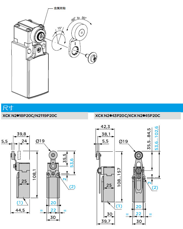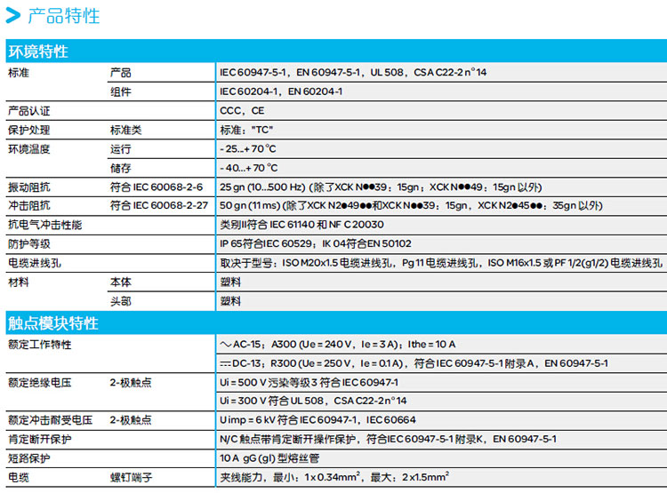 通用型强:符合EN50047标准; 安全性高:双极隔离肯定断开触点; 抗机械强度高:Zamak金属转轴; 应用范围广:全系列操作头; 更优异的性能:左右90度行程,15度任意位置可调.