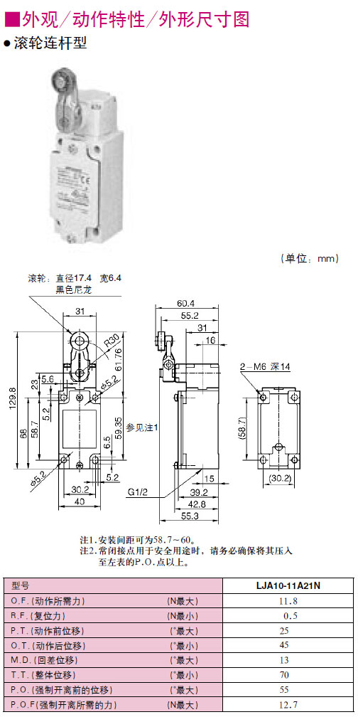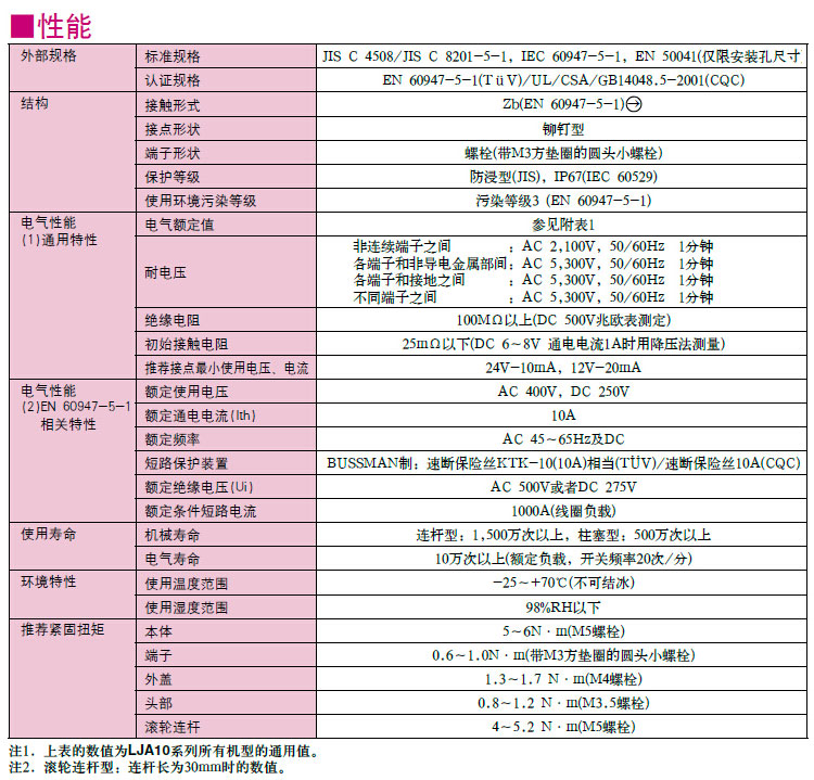 符合EN50041规格; 带ul/csa/ce/ccc标志,最适用于向北美、欧洲、 中国出口的机械; 通过快动机构实现常闭/常开的电气独立接点(Zb); 提高接触可靠性的双接点结构; 应用广泛的LS通用型限位开关、适宜的安装间距; 丰富多样的触动头种类; 防浸型(JIS)、IP67(IEC 60529)的高封密性.