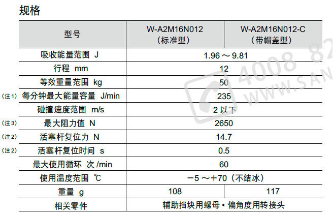 W-A2M16系列重量轻、紧凑小巧的模拟调节式两级动作螺纹型缓冲器(双级动作W型,变则多节流孔/模块调节式)
