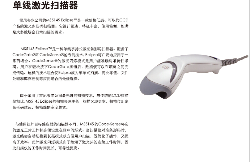 MS5145 Eclipse设计紧凑,特征丰富,使用简便,能满足大多数场合日常扫描的需求.与传统的CCD扫描仪相比,MS5145Eclipse的扫描景深更长,扫描区域更宽.扫描仪距离条形码越远,扫描的宽度越宽.