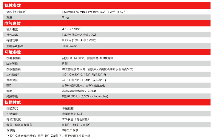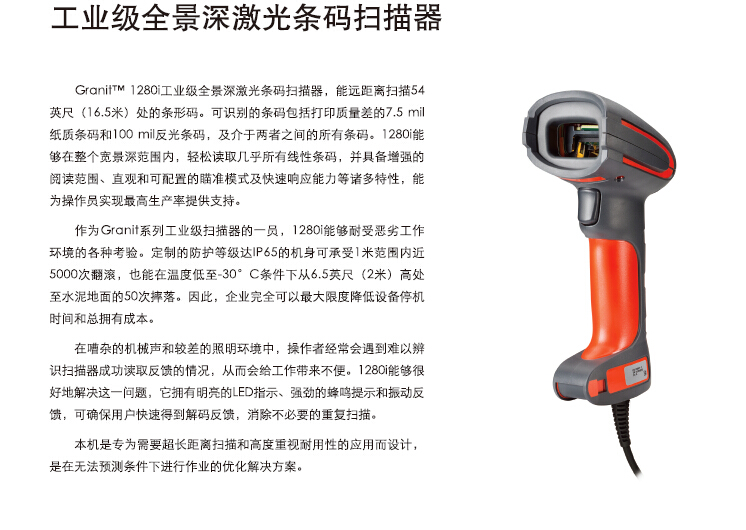 Granit1280i工业级全景深激光条码扫描器,能远距离扫描54英尺(16.5米)处的条形码.可识别的条码包括打印质量差的7.5mil纸质条码和100mil反光条码,及介于两者之间的所有条码.并具备增强的阅读范围、直观和可配置的瞄准模式及快速响应能力等诸多特性,能为操作员实现最高生产率提供支持.