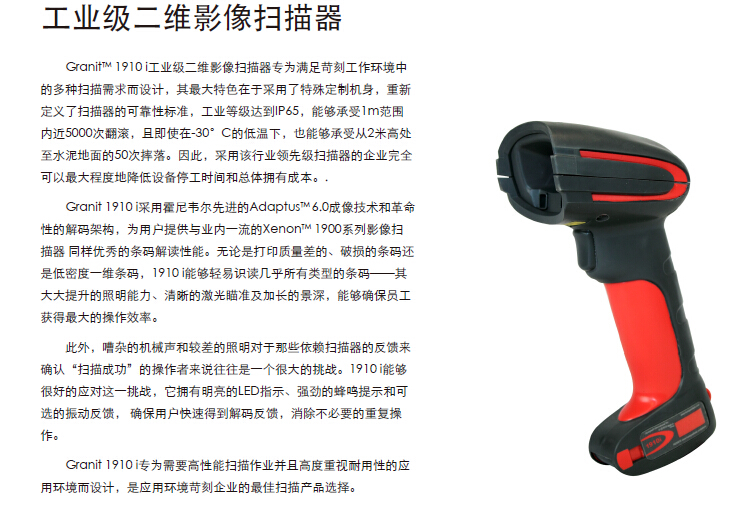 Granit1910i工业级二维影像扫描器专为满足苛刻工作环境中的多种扫描需求而设计,其最大特色在于采用了特殊定制机身,重新定义了扫描器的可靠性标准,是应用环境苛刻企业的最佳扫描产品选择.