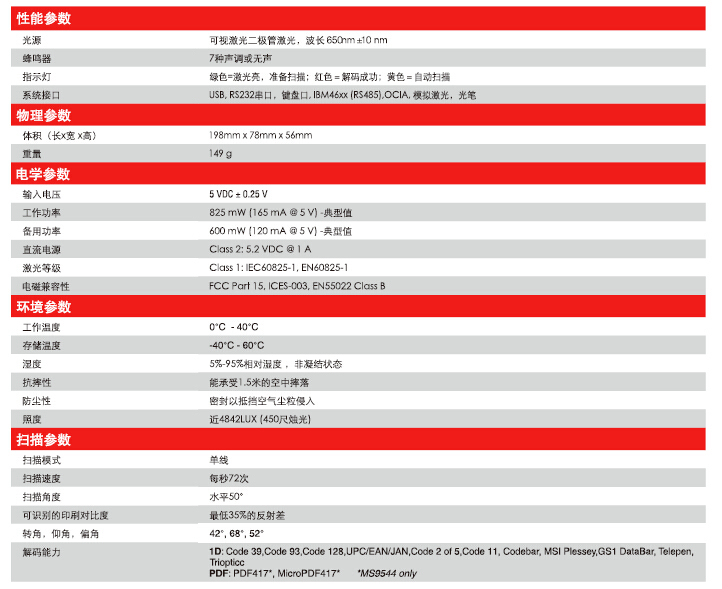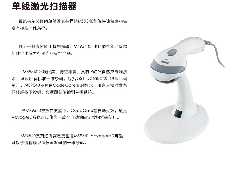 霍尼韦尔公司的单线激光扫描器MS9540能够快速精准扫描所有标准一维条码.作为一款高性能手持扫描器,MS9540以出色的性能和优越的性价比成为行业内的标杆产品.其外形优美,特征丰富,具有IR红外自感应专利技术,识读所有标准一维条码.