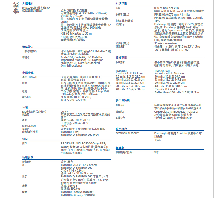 POWERSCAN PM8300系列包括不同的机型,能满足所有用户的需要;PM8300是基础无线机型;PM8300-D中级机型;PM8300-DK高级机型