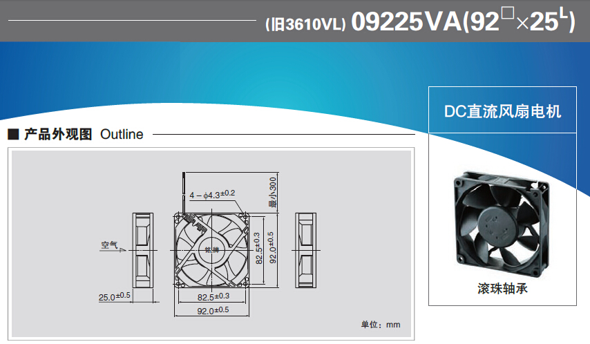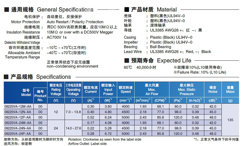 205467/09225VA-12N-AA-00/09225VA系列 滚珠轴承型直流风扇电机