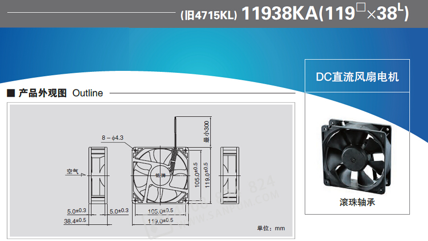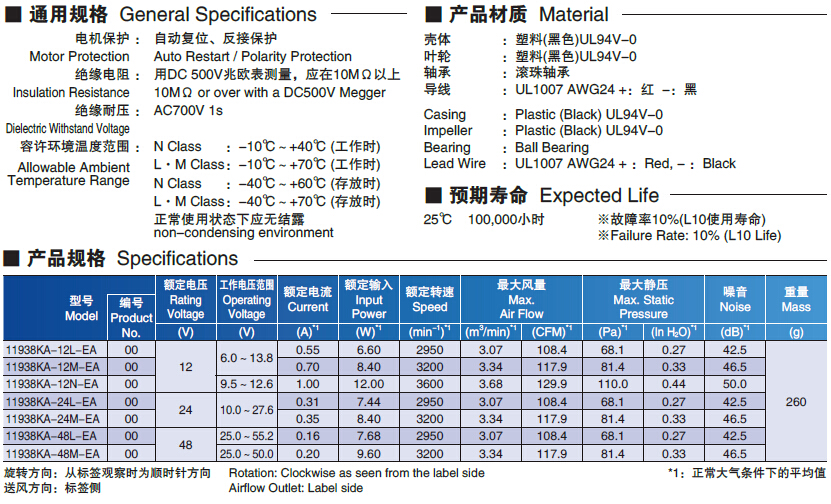 205487/11938KA-12L-EA-00/11938KA系列 滚珠轴承型直流风扇电机