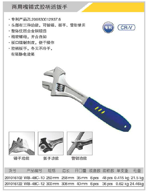 专利产品ZL200830012937.6,头部有三种功能,可做锤、扳手、管钳使用,整体优质合金钢锻造,精密螺母,开合自如,扳口镭射刻度,便于操作,胶柄扳手,冬天不冷手,有隔静电效果.