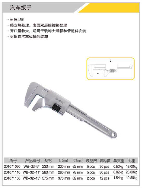 材质45#钢,整支热处理,表面双层镍镀铬处理,开口量特大,适用于装卸大螺帽和管道件安装,更适宜汽车板轴的装卸.