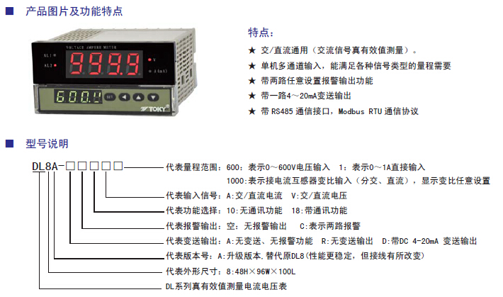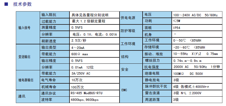 交/直流通用(交流信号真有效值测量);单机多通道输入;带两路任意设置报警输出功能;带一路4~20mA变送输出;带RS485通信接口,Modbus RTU通信协议