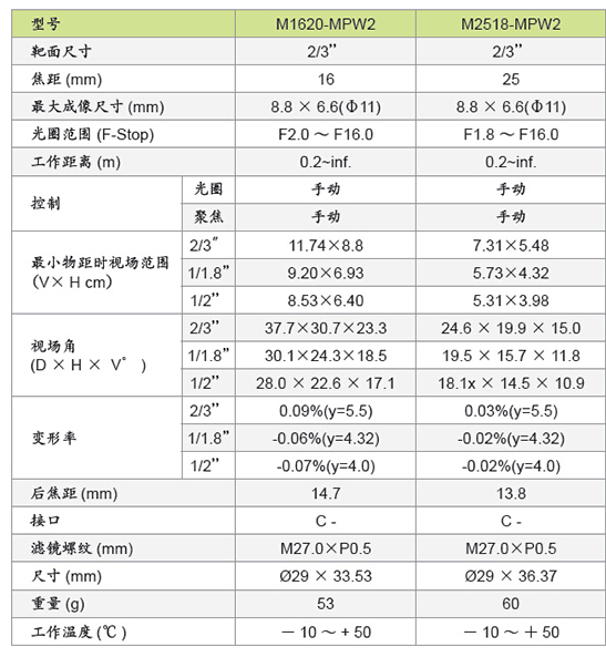 M2518-MPW2 COMPUTAR五百万像素低畸定焦镜头(紧凑型)