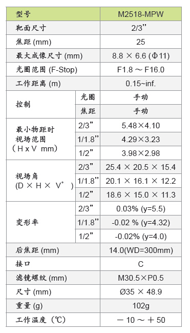 M2518-MPW 五百万像素低畸定焦镜头