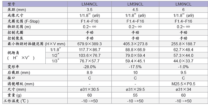 214562/LM6NCL/LM6NCL 1/1.8"入门级FA镜头