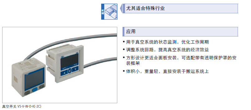 电子式真空开关;测量范围为-1bar至0bar;优化工作周期,调整系统回路,提高真空系统的经济效益;方形设计更适合面板安装;适用于所有自动化搬运领域.