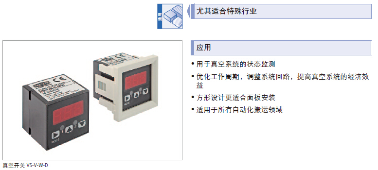 电子式真空开关,坚固的聚碳酸酯外壳;开关可选择单色或双色的显示屏;方形设计更适合面板安装,可选配带有透明保护罩的安装框架;体积小,重量轻,直接安装于搬运系统上.