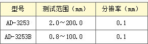 精度:AD-3253/±0.1mm±1.0%(2mm以上100mm以下)・±0.1mm±1.5%(200mm以下)、AD-3253B/±0.1mm±0.5%(0.8mm以上40mm以下)・±0.1mm±1.5%(100mm以下)