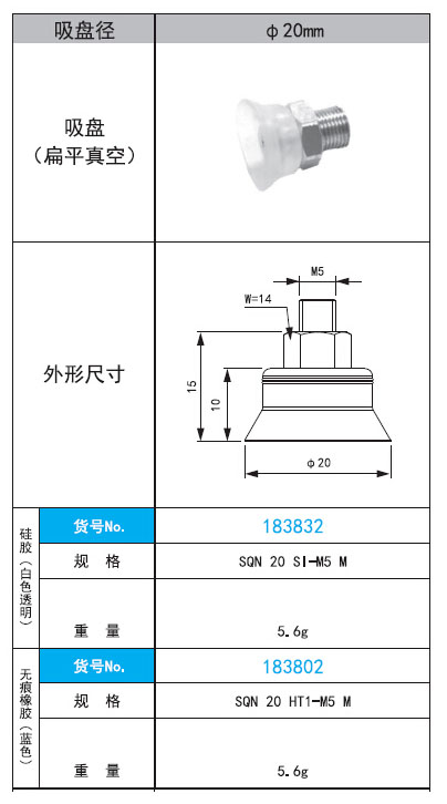SQN 20 -M5 M直径20mm扁平真空式吸盘