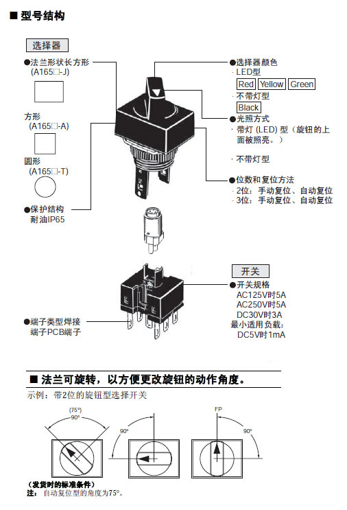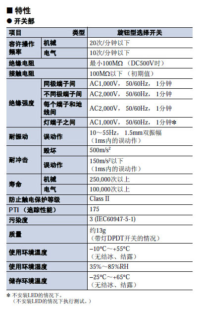 可拆卸圆型Φ16系列; 与28.5mm微型设计的A16系列按钮具有相同的单独构造; 标准负载以及微小负载均可使用的共同接点; 耐油IP65型; 符合EN60947-5-1.
