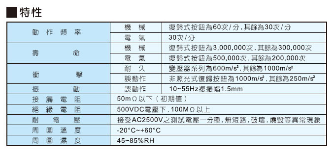 上部与接点座部分可分离; 防水、防油、防尘; 适用于较恶劣的环境; 三段可拆组式开闭。