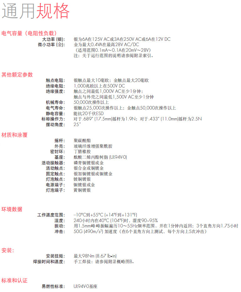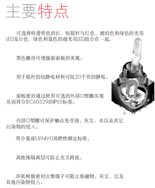 6A大功率或0.4VA微小功率; 半透明摇头开关配有亮或超亮LED; 焊片:衬套安装。