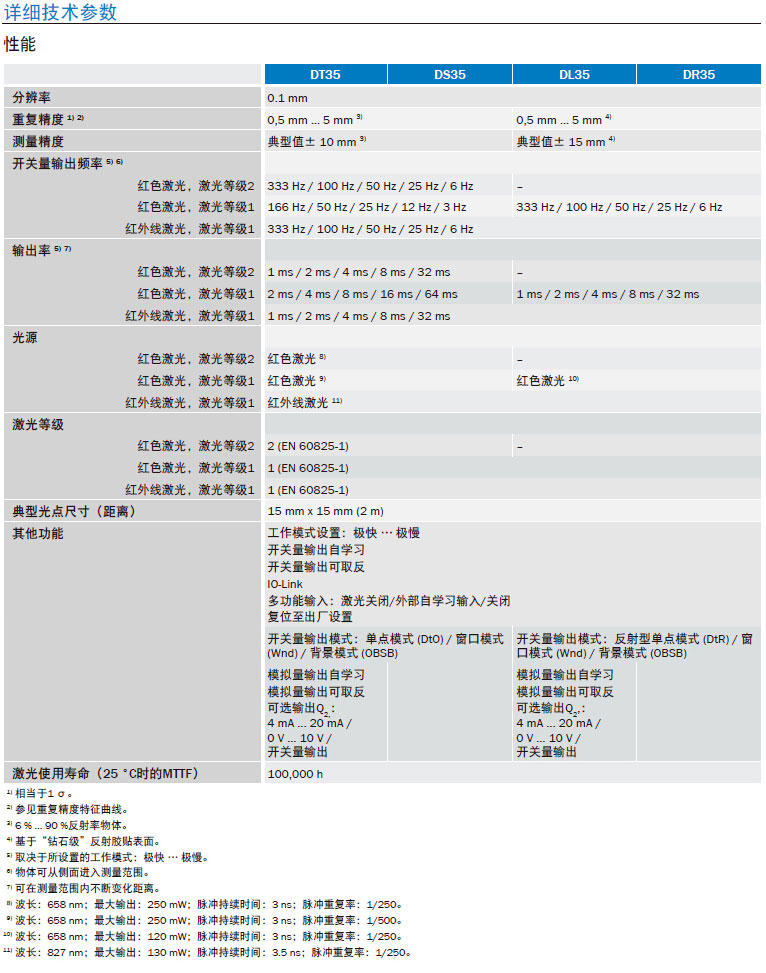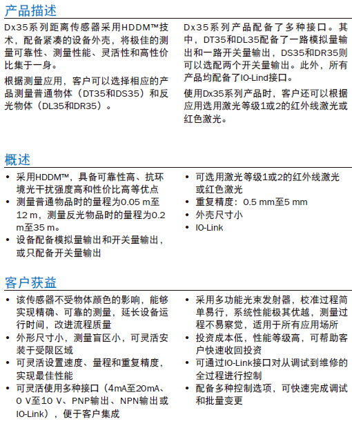 采用HDDM™,具备可靠性高、抗环境光干扰强度高和性价比高等优点; 测量普通物品时的量程为0.05m至12m,测量反光物品时的量程为0.2m至35m; 设备配备模拟量输出和开关量输出或只配备开关量输出; 可选用激光等级1或2的红外线激光或红色激光; 重复精度:0.5mm至5mm; 外壳尺寸小;