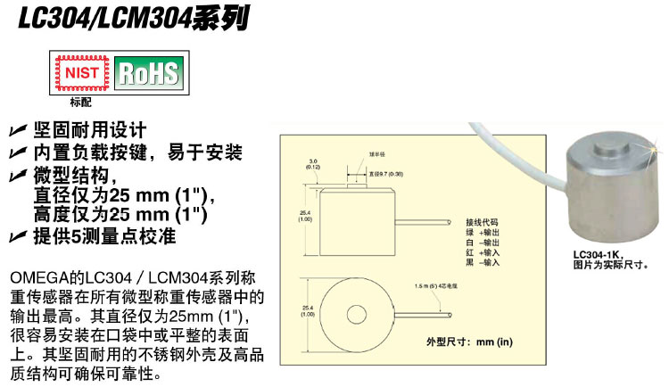 LC304系列直径仅25.4mm(1")的不锈钢压缩称重传感器(标准及公制型号)