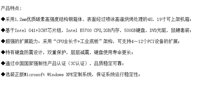 釆用1.2mm优质碳索高强度结构钢箱体,表面经过喷涂高温烘烤处理的4U, 19寸可上架机箱;基于IntelG41+ICH7芯片组,Intel E7500 CPU, 2GB内存,500GB硬盘,DVD光驱,鼠键套装;超强的扩展能力:采用“CPU全长卡+工业底板”的架构,可支持4~12个PCI设备的扩展;特有硬盘防震设计,双重保护,居居减震,硬盘使用寿命更长;通过中国国家产品认证(3C认证),品质稳定可靠;选装正版Microsoft Windows XPE定制系统,保证系统运行稳定性;睿驰(RICH)系列行业专用计算机享有华北工控全国范围内长达24个月的免费上门服务.