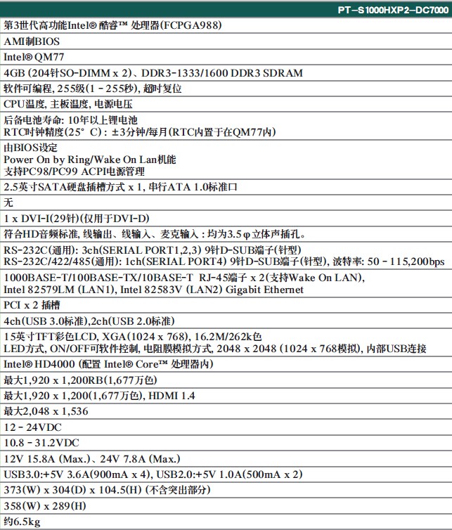 第3世代高功能Intel®酷睿™处理器(FCPGA988);支持1920x1200外部DVI/HDMI/模拟量RGB输出;配置2x PCI / 双LAN端ロ / 4x USB3.0 / 2x USB2.0 / 4x COM / HD音频以及其它丰富的扩展接口;15英寸LCD长寿命触摸屏和LED节能背灯;IP65前面板防水保护;便于拆卸的2.5英寸SATA存储设备机架.