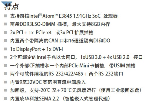支持四核Intel® Atom™ E3845 1.91GHz SoC 处理器;两条DDR3LS0-DIMM插槽,最大支持8GB内存;2x PCI + 1x PCIe x4 或3x PCI 扩展插槽;内置两个带隔离的CAN 口和16通道隔离DI和DO 1x DisplayPort + 1x DVI-I;2个可绑定的Intel千兆以太网口,1xUSB 3.0 +4x USB 2.0 接口;—个外部CF插槽和一个内部PCIe Mini卡插槽,带USIM插槽;两个可软件编程的RS-232/422/485 +两个RS-232端口;内置9至32VDC宽范围直流电源输入;加固级,支持-20°至+70°无风扇运行(使用工业级固态盘) 内置凌华科技SEMA 2.2 (智能嵌入式管理代理).