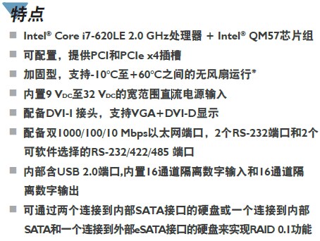 Intel® Core i7-620LE 2.0 GHz 处理器 + Intel® QM57 芯片组;可配置,提供PCI和PCIex4插槽;加固型,支持-I0°C至+60°C之间的无风扇运行*;内置9VDC至32VDC的宽范围直流电源输入;配备DVI-I接头,支持VGA+DVI-D显示;配备双1000/丨100/丨10Mbps以太网端口,2个RS-232端口和2个可软件选择的RS-03/422/485端口;内部含USB 2.0端口,内置16通道隔离数字输入和16通道隔离数字输出;可通过两个连接到内部SATA接口的硬盘或一个连接到内部 SATA和一个连接到外部eSATA接口的硬盘来实现RAID 0.1功能.